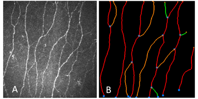 Segmentation of corneal nerves from in vivo confocal microscopy images. Major nerves (red) are identified based on tortuosity in contract to larger (orange and minor (green) branching nerves. Segmentation is the first step to quantitative nerve evaluation in relationship to the disease.